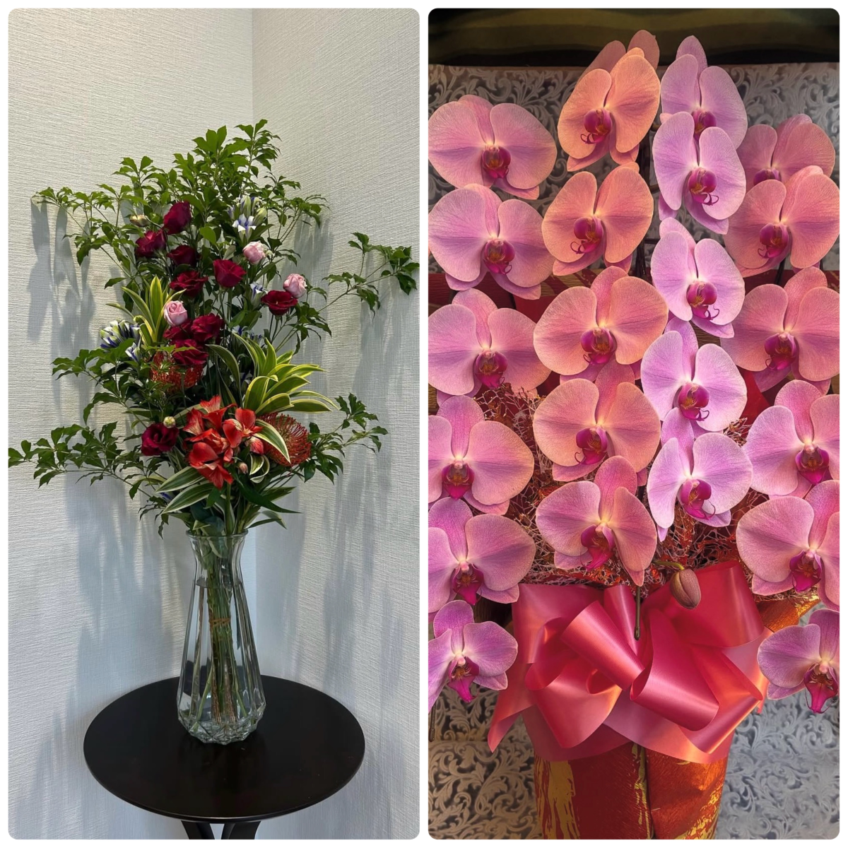 鮮やかな季節花を贅沢に束ねたフラワーアレンジメントと、存在感あふれる気品高い胡蝶蘭。