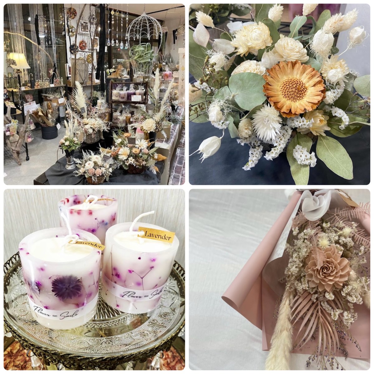 店内には、繊細で美しいドライフラワーをはじめ、アロマキャンドル、香りを楽しむサシェ、光を運ぶサンキャッチャーなど、日々を心地よくする雑貨が並びます。花のある暮らしに、やさしい香りときらめきを添えてくれる場所。