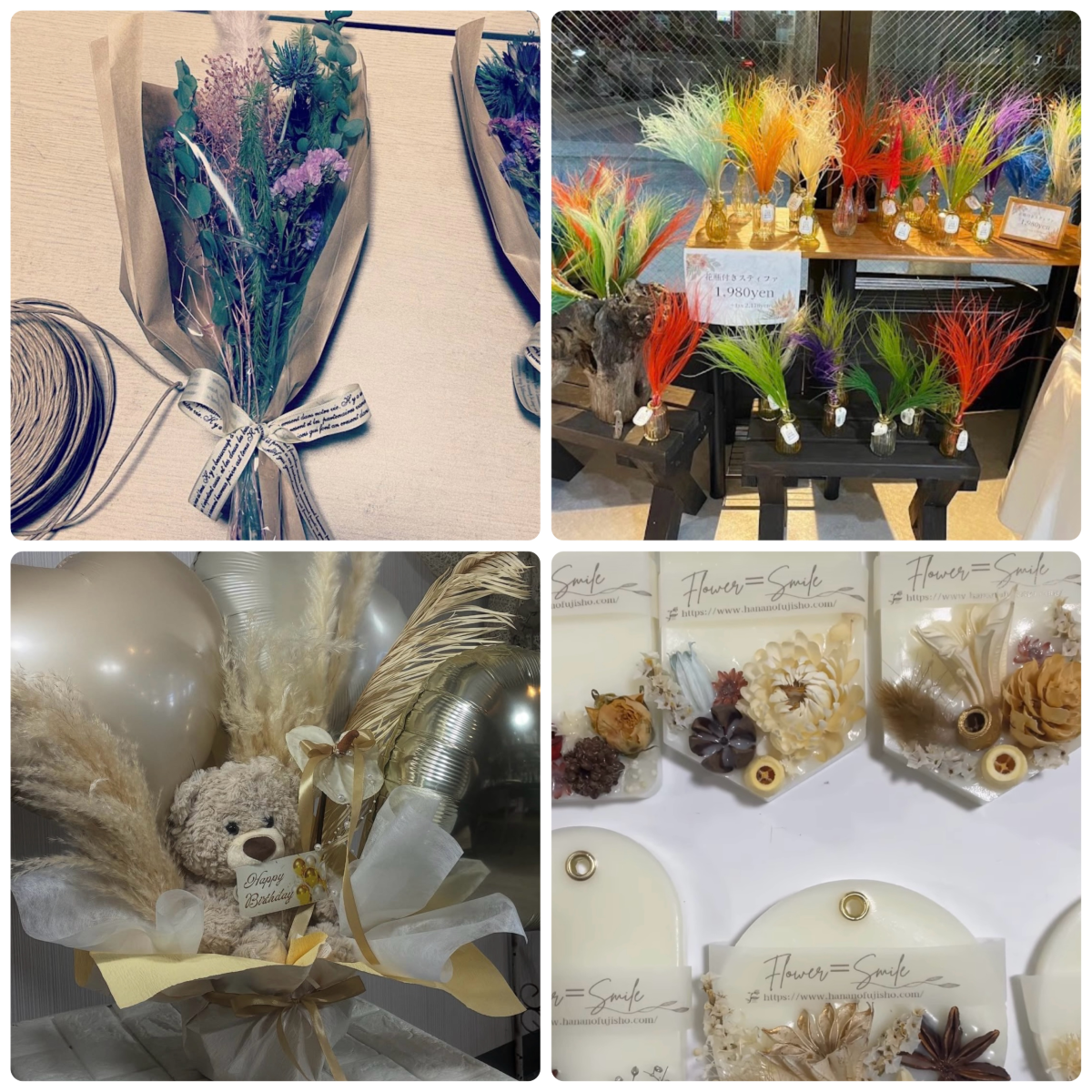 ナチュラルで長く楽しめるドライブーケ、虹色にきらめくフェザースティック、上品な香りと美しさを閉じ込めたアロマサシェ、そして思わず笑顔になるテディベア入りギフトアレンジまで。
