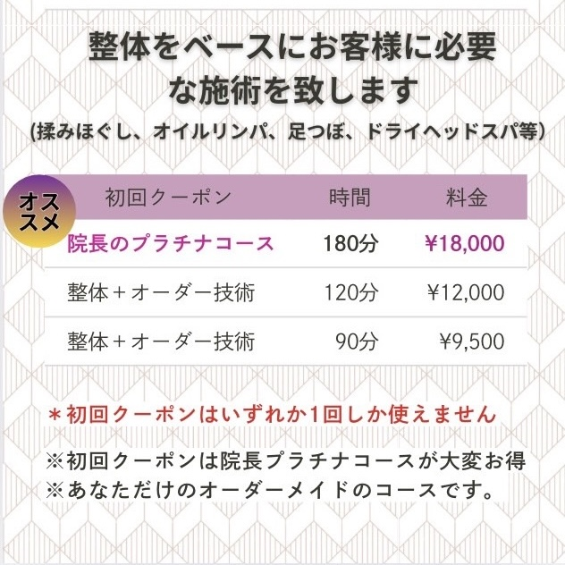 院長のプラチナコース180分30,000円(初回割引クーポン有り)