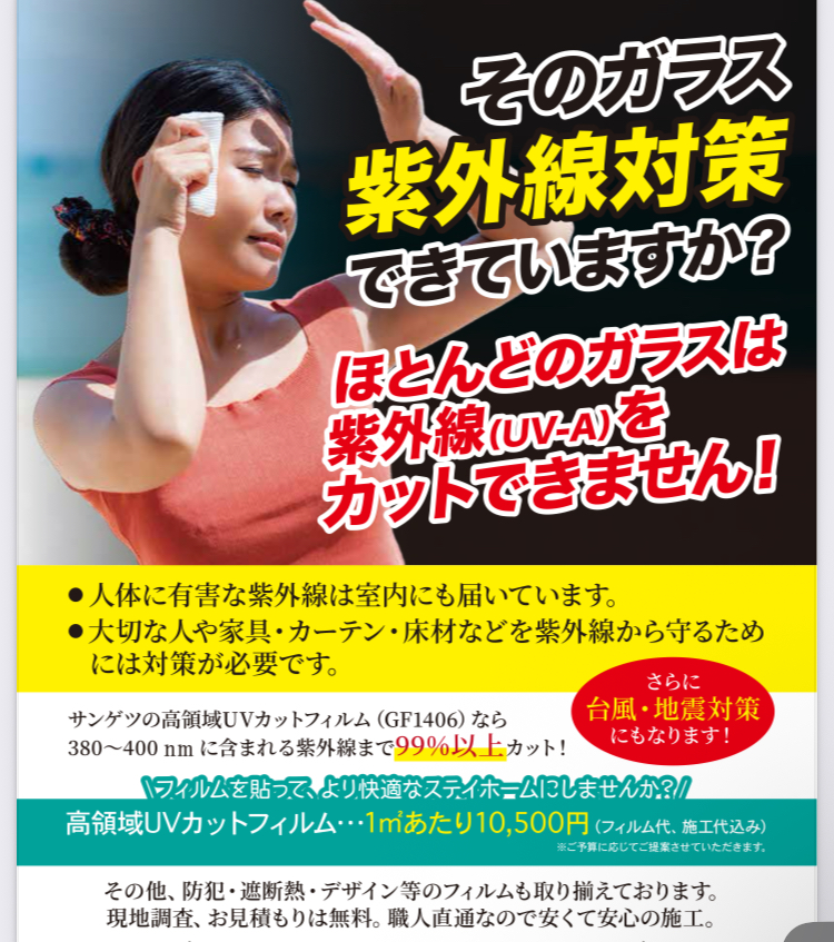 家や事務所の窓フィルムを貼る事により災害があった時の割れたガラスによる二次災害の防止や紫外線カット、遮熱、断熱フィルムによる体で感じる節電効果、防犯フィルムによる安心感、窓フィルムによる低予算の施工によりあなたの希望が叶うかも😊