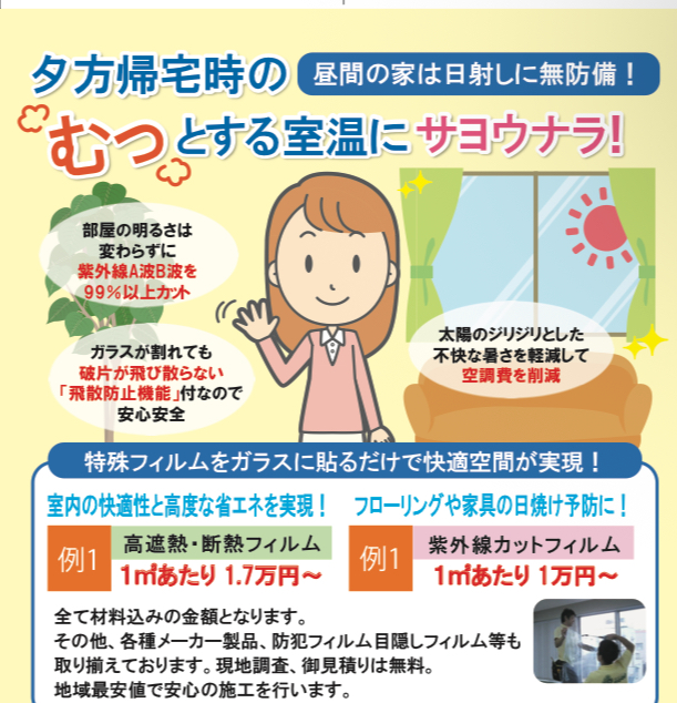 遮熱、断熱フィルムを貼る事で夏は暑さを室内に入れず室温上昇を抑え、冬は室内の暖かい空気を逃さず、エアコンの稼働が減り、節電効果が得られます。
