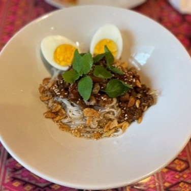人気の「ミャンマーカレー」は、じっくり煮込まれた肉がほろりとほどけ、スパイスの香りとともに口いっぱいに広がる濃厚な味わい。ミャンマー風の麺料理「モヒンガー」や「シャンカウスエ」など、日本ではなかなか出会えない郷土メニューも楽しめます。店内はオレンジを基調とした温かみのある空間で、ランチはもちろん、ディナーでもゆったりとした時間を過ごせます。沖縄にいながら、まるでヤンゴンの食堂にいるような、異国の風を感じてみませんか?