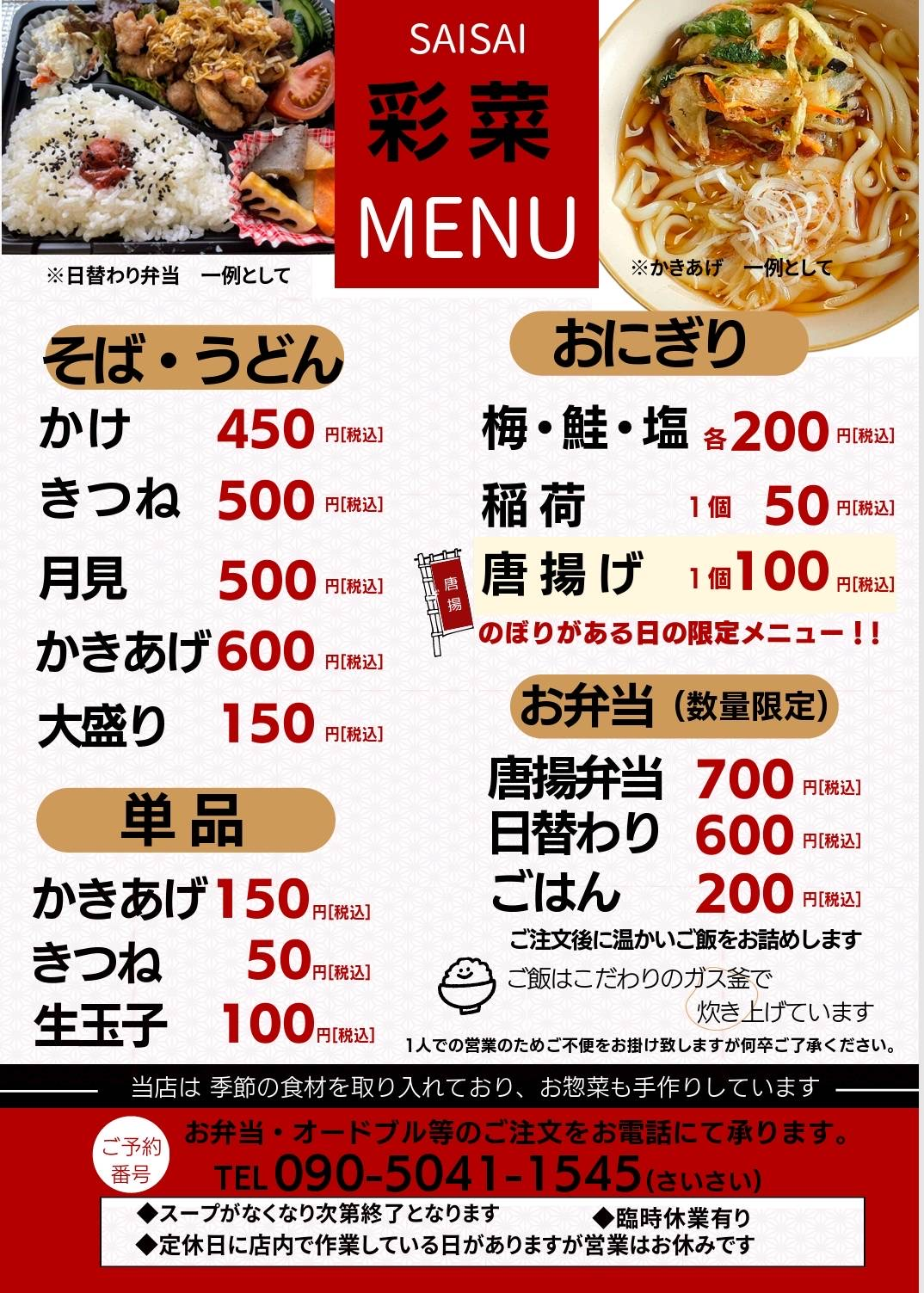 | 営業時間 | 木曜日.金曜日.土曜日 11:00〜14:00 火曜日.水曜日 〈予約弁当のみ〉 |