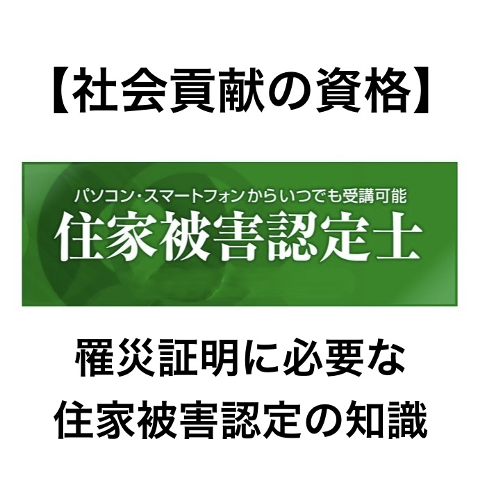 住家被害認定士は、罹災証明に必要な“住家被害認定”の正しい知識を学べる資格です。パソコンやスマートフォンから受講可能で、専門知識がなくても安心してスタートできます。被災者支援に役立つだけでなく、地域活動や信頼構築にもつながる社会的価値の高い資格です。
