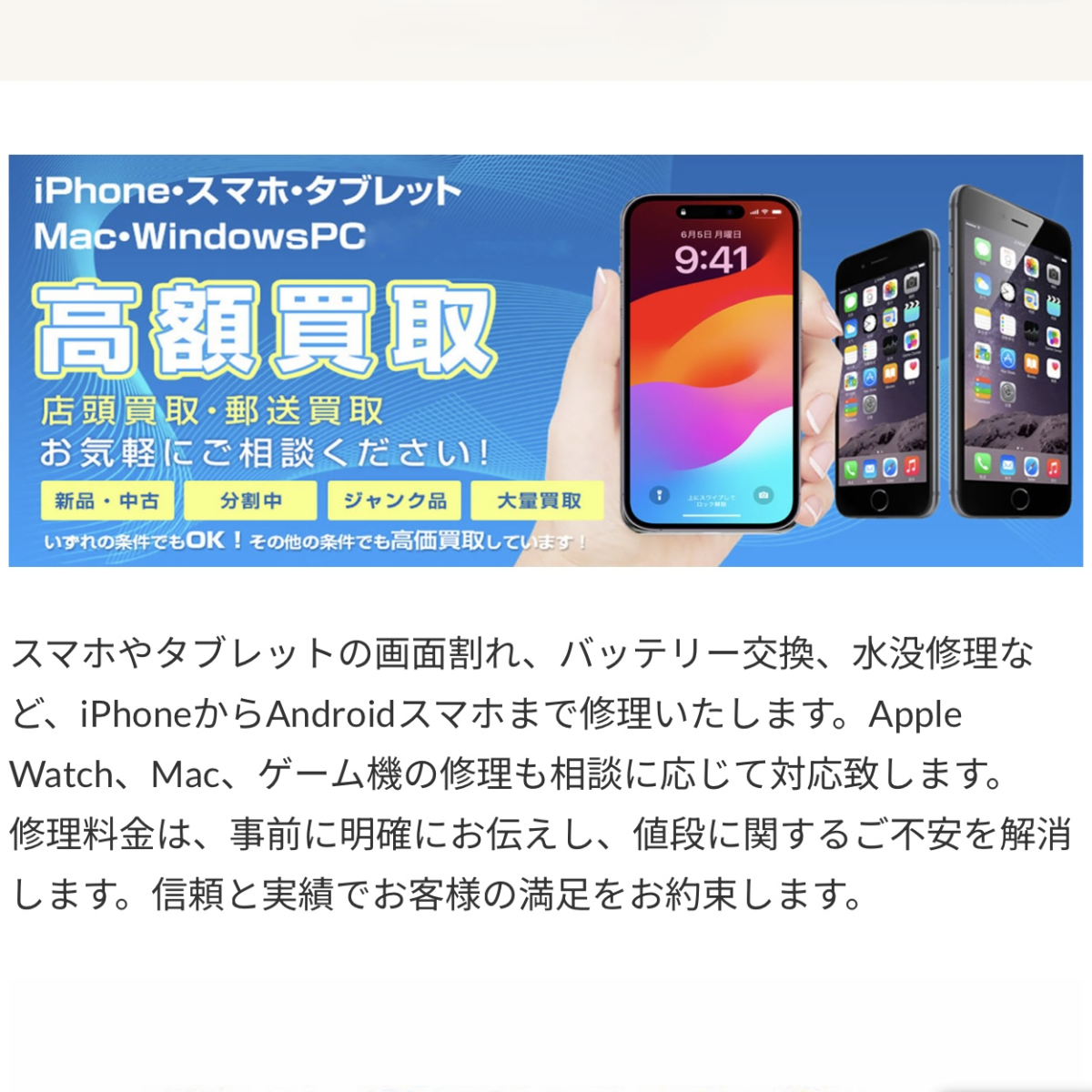 画面割れ、バッテリー交換、水没修理