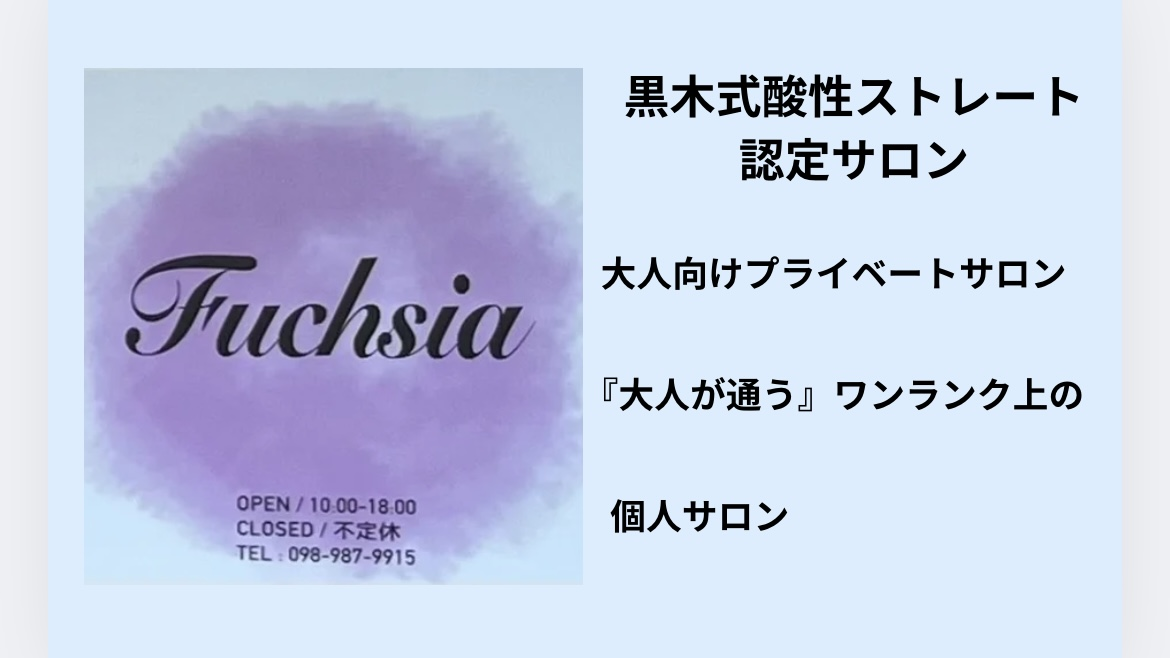 New Fuchsia 【フーシャ】 沖縄県内初!黒木式酸性ストレート認定サロン Fuchsia(フーシャ) は、女性の“永遠美”をテーマに、一人ひとりの魅力を最大限に引き出す予約優先・完全予約制の大人が通うワンランク上のプライベートサロンです。 落ち着いた空間で、ゆったりとしたサロン時間をお過ごしいただけます 沖縄県 美容 ポイント最大オフ 5%