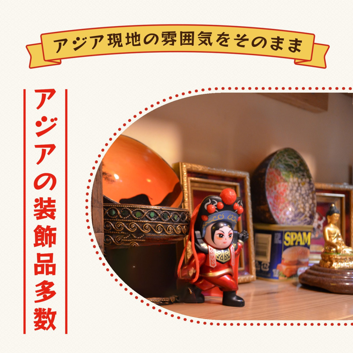 タイ・ベトナム・ラオスの本格エスニック料理とアジア各国のお酒を堪能しながら、バッグや雑貨などのアジアン小物も選べる“食とショッピング”が一度に楽しめる異国情緒あふれる居酒屋