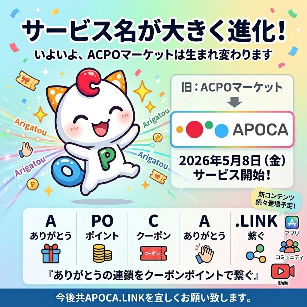 日本中に沢山の「ありがとう」と「お得」を繋ぐプラットフォームとして、これからもサービス向上して参りますので、今後共APOCA.LINKを宜しくお願い致します。