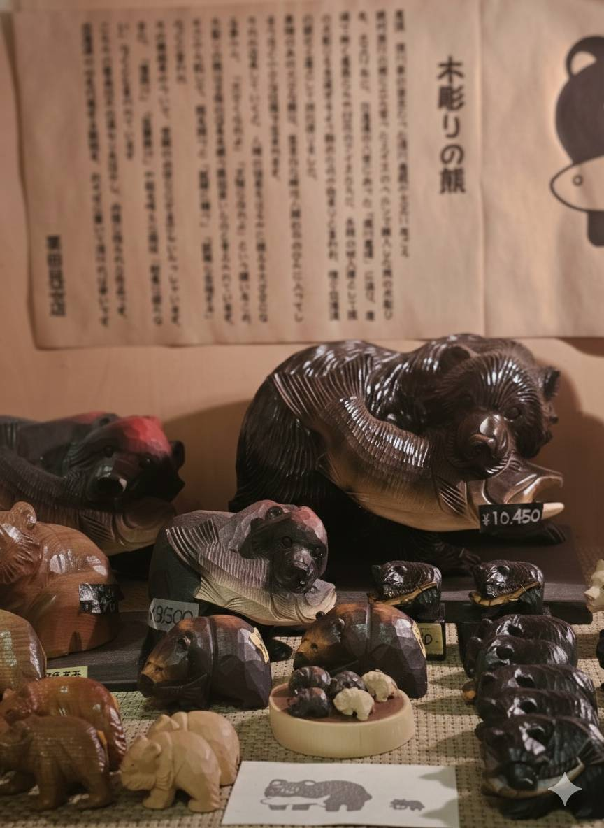 力強く鮭を咥えた伝統的な姿から、掌に収まる愛らしいサイズまで。職人がノミ一本で彫り上げた毛並みの質感や、一頭ごとに異なる表情は、まさに芸術品。背後に掲げられた店主の解説が物語るように、その一つひとつに、北海道の開拓史と職人の魂が息づいています。